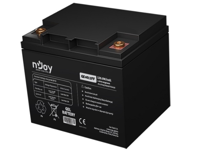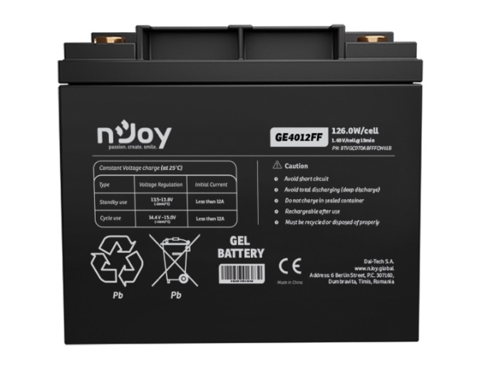 Acumulator UPS, sigilat complet si fara intretinere, tehnologie GEL Deep-Cycle, incarcare si reincarcare eficiente, autodescarcare limitata, tehnologie Pb-acid Deepcycle, terminal T6 (M6) din cupru, tensiune nominala 12V, 40 Ah, uz in floating si standby pana la 9 ani, mai mult de 400 de cicluri la 100% DOD, putere (1.65 V / celula @ 15 min) 126.0 W / celula, valva siguranta din EPDR, carcasa din ABS, dimensiuni 197 x 165 x 172 mm fara terminal (197 x 165 x 172 mm cu terminal), greutate 12.2 kg