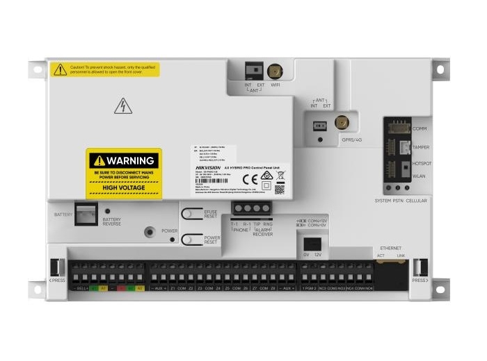 Placa centrala AX HYBRID PRO G2 cu 128 zone (8 zone pe placa) si 128 iesiri, 64 partitii, 2 iesiri PGM pe placa, 2 iesiri releu pe placa, posibilitate conectare 48 camere-PIR, posibilitate programare 256 scenarii automatizare, 2 porturi Bus, tehnologie Bus - half-duplex RS-485, interfete comunicare - LAN/Ethernet, Wi-Fi (2.4GHz), GPRS, 4G/LTE, PSTN, alimentare principala 100-240VAC 50/60Hz, 0.3A, alimentare auxiliara cu 1 acumulator SLA neinclus de 12VDC 7Ah