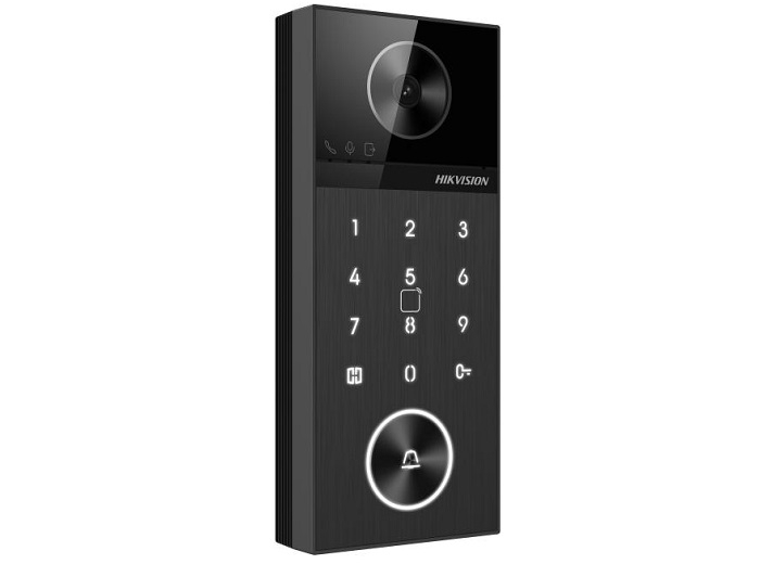 Post de exterior cu tastatura, 1 buton de apelare si camera 4MP, unghi de vizualizare 150° (H), 75° (V), IR 3m, multiple metode de deschidere (card Mifare 1, cod PIN, Hik-Connect, post de interior), capacitate 2000 utilizatori si 10000 de carduri, microfon omnidirectional si difuzor incorporate, control 2 yale, 4 intrari alarma, accepta card TF max. 128 G, 3 indicatoare LED, IP65, montare aplicata, dimensiuni 164 x 69 x 24.7 mm, alimentare 12VDC/PoE
