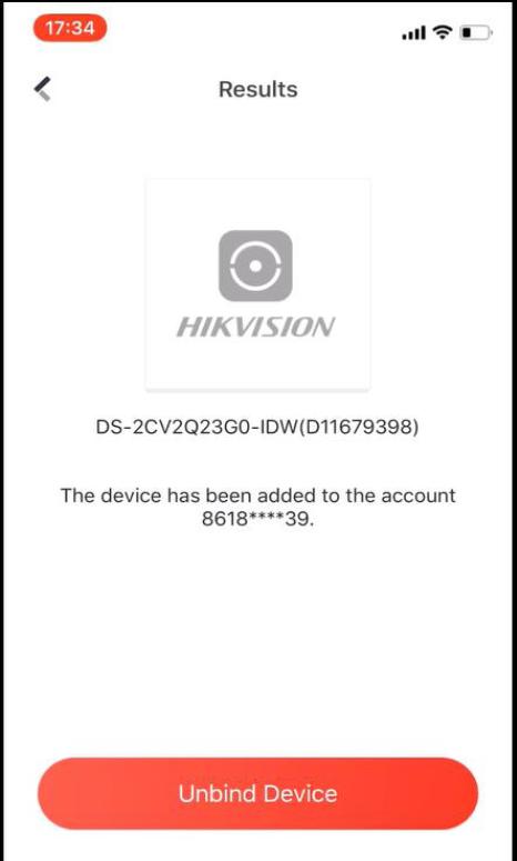 3. Daca dispozitivul a fost asociat cu un alt cont Hik-Connect, aplicatia va returna un mesaj cu aceasta informatie si optiunea de stergere dispozitiv. Se va apasa butonul Unbind Device.