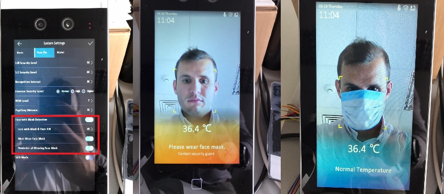 Daca dorim sa mergem mai departe, este posibila activarea functiei de detectie masca, care in conjunctie cu masurarea temperaturii vor afisa date specifice.