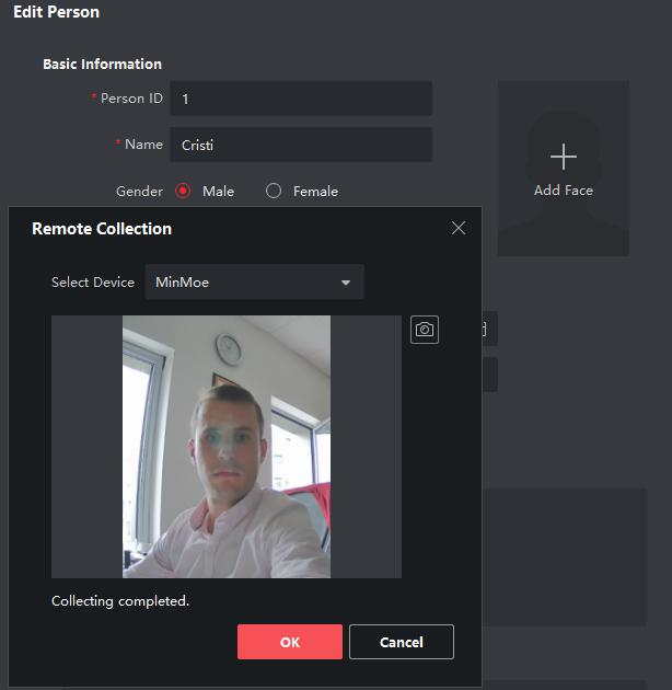 Se va naviga in meniul Person si se va apasa butonul + pentru adaugare utilizator. Exista mai multe campuri care pot fi completate cu informatii specifice persoanei adaugate. Printre acestea, se poate incarca o fata pentru noua persoana prin apasarea butonului +. Trei optiuni sunt disponibile: upload poza de pe PC-ul cu ivms, Take Photo de la un web cam sau Remote Collection prin intermediul MinMoe.