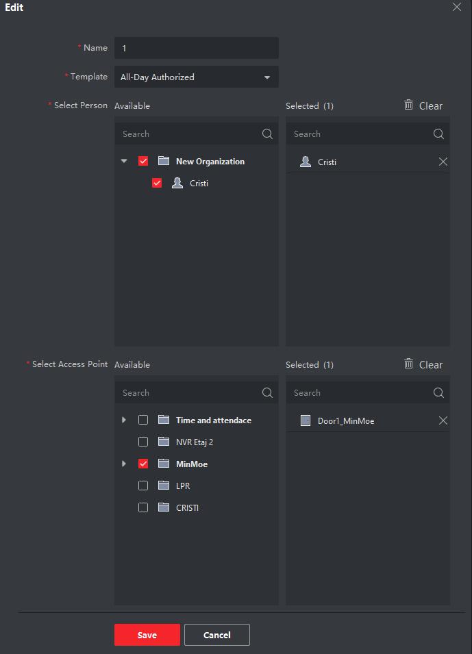 Datele definite mai sus necesita sincronizare cu terminalul MinMoe. Pentru aceasta se va naviga in iVMS in meniul Access Control->Authorization->Access Group, de unde se va defini un grup de control acces cu date specifice ca template de orar pentru acces, persoana/persoanele care fac parte din grupul respectiv si terminalul/terminalele care vor fi asociate cu grupul respectiv. Setarile sunt salvate la apasarea butonului OK, urmate de incarcarea efectiva in terminal.