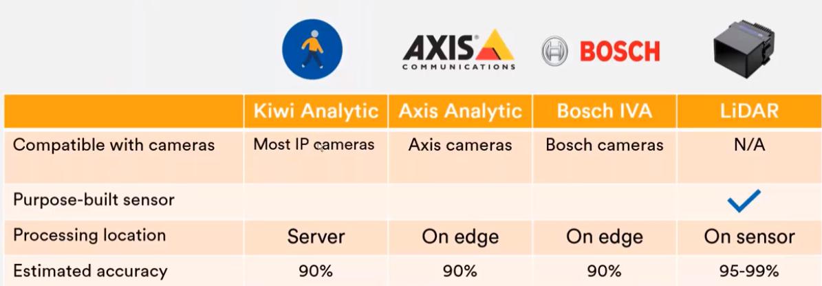 La solutiile bazate pe camere de supraveghere video se mai adauga un senzor de contorizare persoane LiDAR Quanergy, special proiectat pentru capturarea persoanelor care patrund in campul vizual al acestora. Mai multi senzori asociati cu tot atatea usi pot fi agregati in vederea vizualizarii numarului total de persoane din interiorul magazinului.