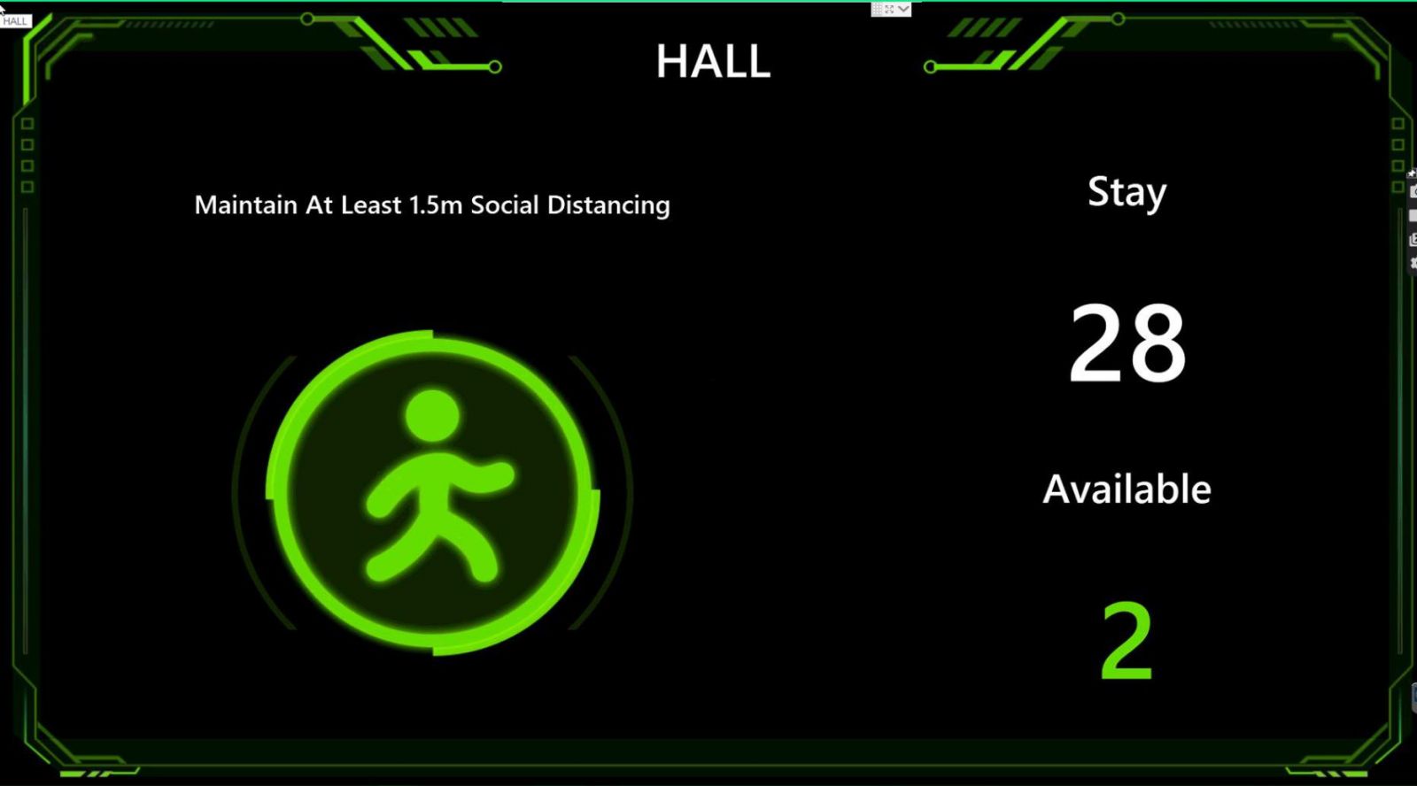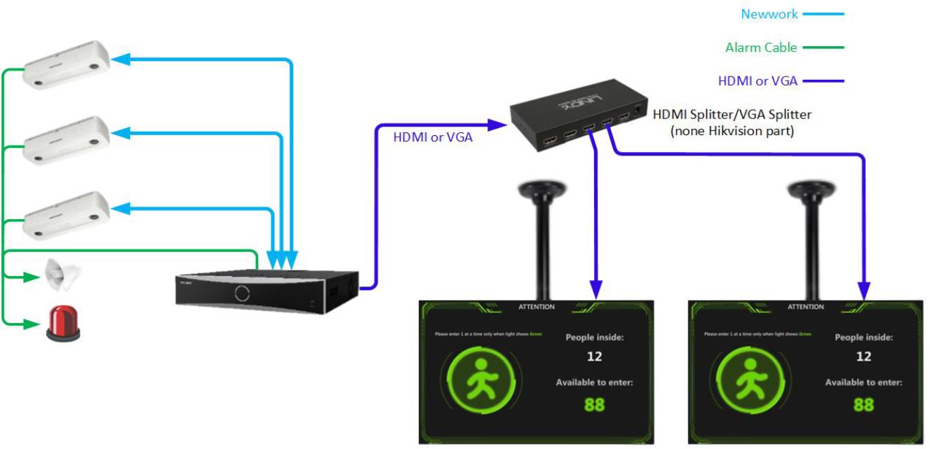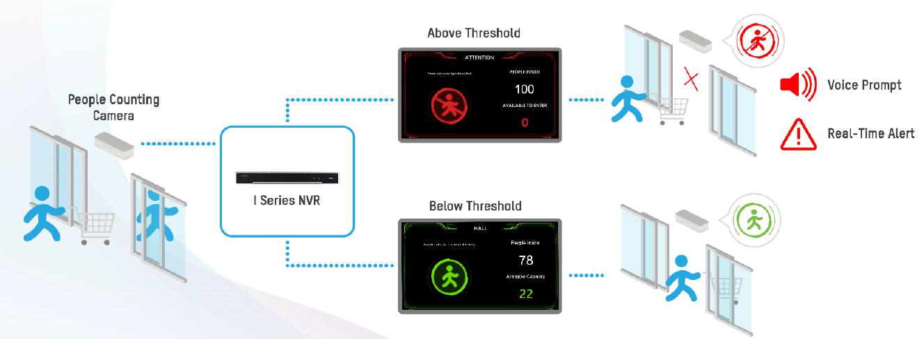 NVR din generatia I, conectat la un monitor de regula instalat la intrarea in perimetru unde vor fi informatii referitoare la numarul de persoane prezente in spatiul respectiv si numarul de persoane care mai pot accede