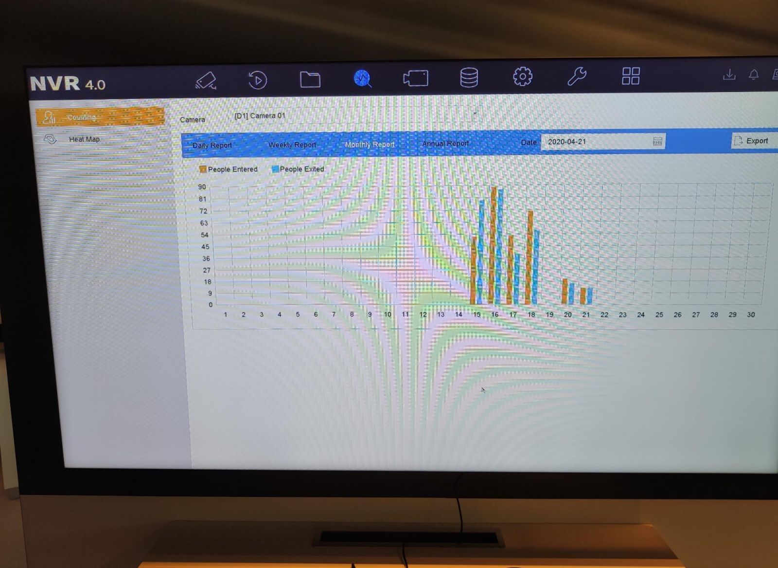 Avand informatiile stocate pe HDD, NVR-ul permite efectuarea unor rapoarte pe zile, saptamani, camere si exportarea acestora in format .xls.