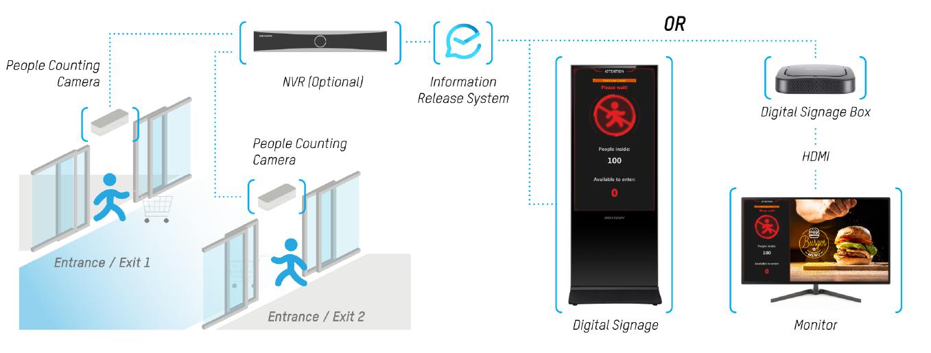 Pentru solutiile de mai sus de afisare a informatiilor pe monitoare conectate fizic la NVR sau PC client (HikCentral Control Client), cei de la Hikvision pun la dispozitie o gama completa de produse de digital signage. Software, decoder digital signage si monitoarele sunt elementele care pot completa solutia de control al densitatii numarului de persoane. Aceste produse permit afisarea reclamelor, mesajelor sau instructiunilor sub forma de text static sau clipuri video.
