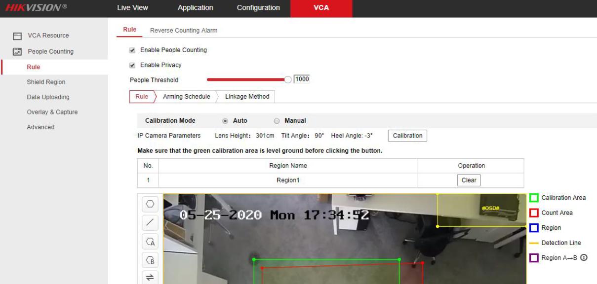 Din interfata web a camerei, Configuration->VCA->Rule, se va activa functia de people counting si se va defini pragul (numarul maxim de persoane care pot patrunde in zona respectiva).