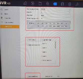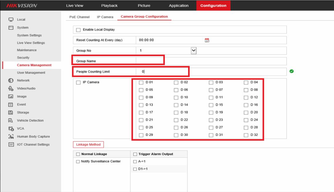 Din interfata web a NVR-ului se va defini o zona compusa din camerele amplasate pe caile de acces. Acesta va afisa in timp real informatii relevante, numar de peroane in incinta si numarul de persoane care pot accede. Informatiile referitoare la gruparea camerelor se regasesc accesand interfata web a NVR-ului Configuration->Camera Management. Din aceeasi interfata se va stabili si pragul limita. De asemenea, se poate crea o metoda de legatura la depasirea acestei valori, cum ar fi notificarea centrului de monitorizare (aplicatii ca iVMS-4200, Hik-Central, Hik-Connect) si/sau activarea unui port de alarma (local de la nivelul NVR-ului, sau al camerelor).