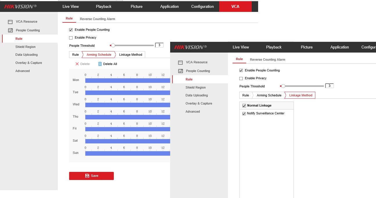 Din Arming Schedule se defineste programul de activare a functiei de contorizare persoane, iar din Linkage method trebuie pusa bifa pe Notify Surveillance Center pentru a transmite datele NVR-ului.