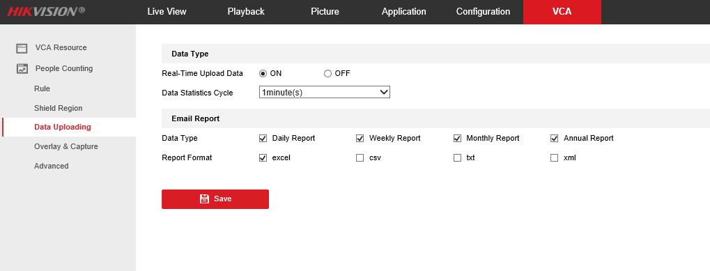 Din interfata web a camerei se va naviga in meniul VCA->VCA Resource si se va activa functia People Counting.