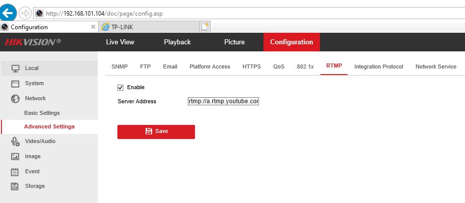 Din Network->Advanced Settings->RTMP, activam functia de streaming RTMP si la server address se va completa cu URL-ul extras mai sus, adica: rtmp://a.rtmp.youtube.com/live2/ b2pd-f390-yyxq-dsqq-0ehy