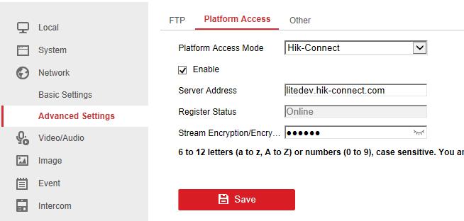 Din Avanced Settings se va activa serviciul Hik-Connect, lasam la adresa server valoarea implicita (litedev.hik-connect.com), definim o cheie de criptare flux video si efectuam un click pe butonul Save. In functie de calitatea retelei, starea de inregistrare va trece din offline in online.