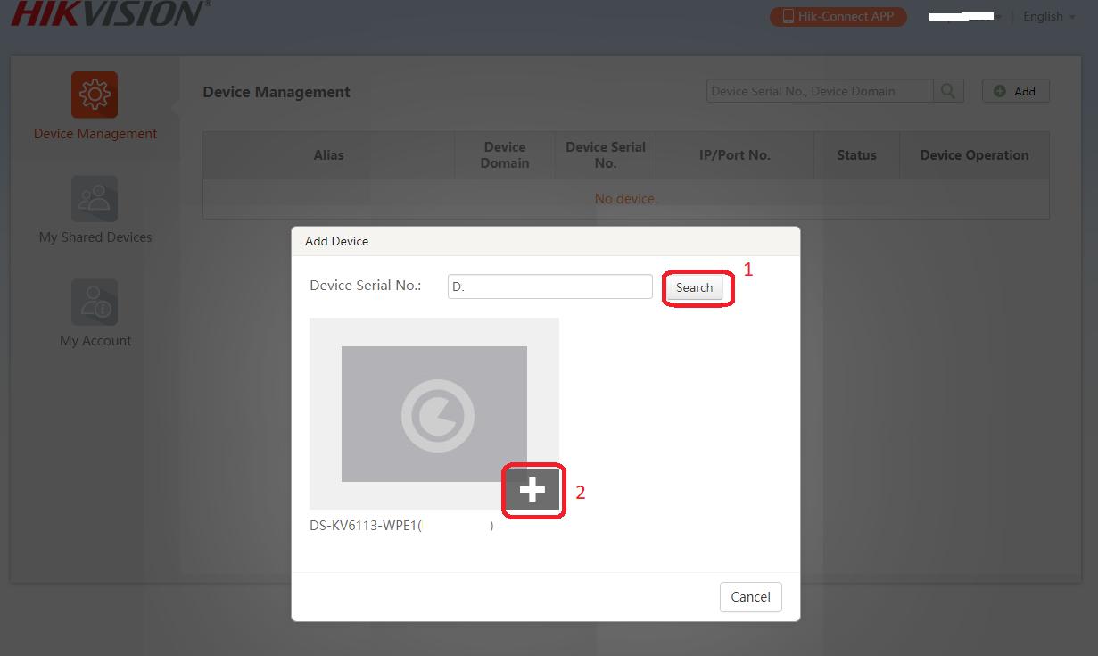 In campul Device Serial No se va completa cu serialul produsului apoi click Search. Avand serviciul online de Hik-Conect, la apasarea butonului Search, platfoma ne va returna codul postului de exterior. Click pe simbolul + pentru a avansa in etapa de inrolare.