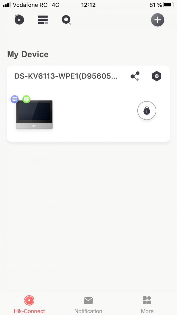 Dupa autentificarea cu succes in aplicatie, vom gasi postul de exterior online. HikConnect permite controlul usii fara initierea unei conversatii de la exterior, precum si accesul la imagini live.
