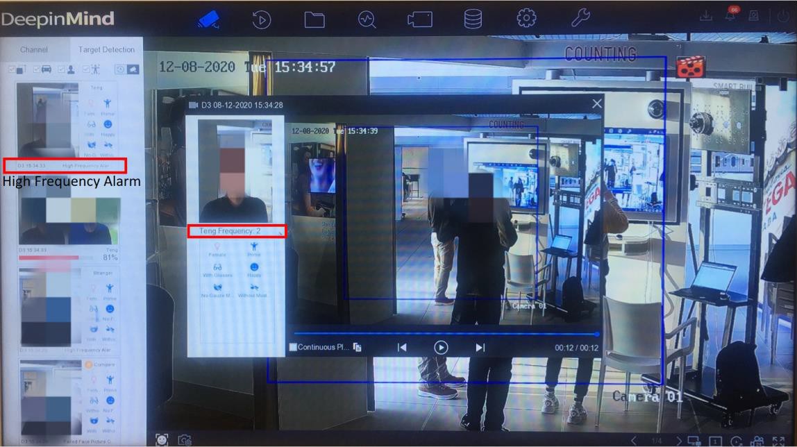 1. Clasificare video in timp real. Bazata pe un algoritm de deep learning in combinatie cu un procesor puternic, clasificarea video in timp real permite clasificarea obiectelor precum oameni sau vehicule, atribuindu-le etichete specifice ca sex, varsta, prezenta ochelarilor, masca, barba, culoare imbracaminte, bagaj, tip vehicul si culoare vehicul etc. Aceste informatii sunt afisate in timp real pe monitorul conectat fizic la NVR-ul DeepinMind.