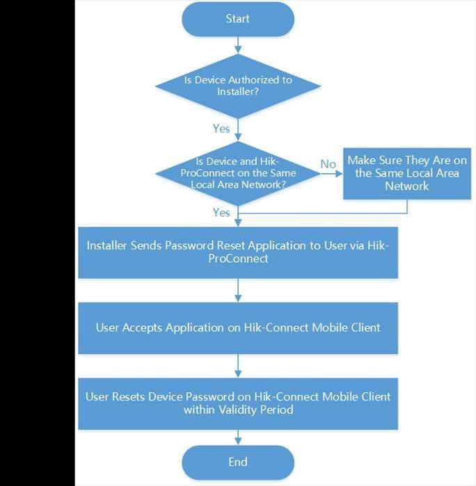 2. Resetare parola dispozitiv. Aceasta metoda de recuperare functioneaza doar daca sistemul este monitorizat prin intermediul paltformei Hik ProConnect. In caz afirmativ, utilizatorul poate reseta parola doar cu ajutorul unui cont de installer (definit in Hik ProConnect). Installer-ul trebuie sa fie logat in aplicatia HikConnect si in aceeasi retea cu dispozitivul pentru care utilizatorul final doreste recuperarea parolei. Instalatorul trimite cererea de recuperare a parolei catre contul beneficiarului. Acesta primeste acest mesaj in HikConnect de unde va putea sa isi defineasca o noua parola.