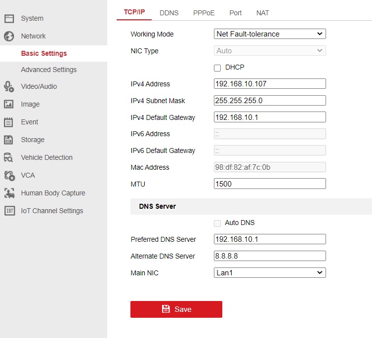 2. Verificare adresa IP. Una din cauzele pentru care serviciul Hik-Connect refuza sa devina online consta in faptul ca reteaua in care dispozitivul este conectat nu are acces la internet. Presupunem ca reteaua are acces la internet, drept urmare se va naviga in submeniul Network->Basic Settings, se va activa optiunea DHCP, apoi Save. Serverul DHCP, in majoritatea situatiilor, routerul WiFi, va asigna o adresa IP din lista de IP-uri disponibile. Se dezactiveaza DHCP-ul, lasam datele primite de la router, ca adresa IP, masca, gateway, iar la DNS principal (in vocabularul Hikvision, "preffered" = "preferat") vom introduce adresa IP a routerului, iar ca DNS secundar (altenativ) vom introduce 8.8.8.8 (nu altul decat serverul public Google).