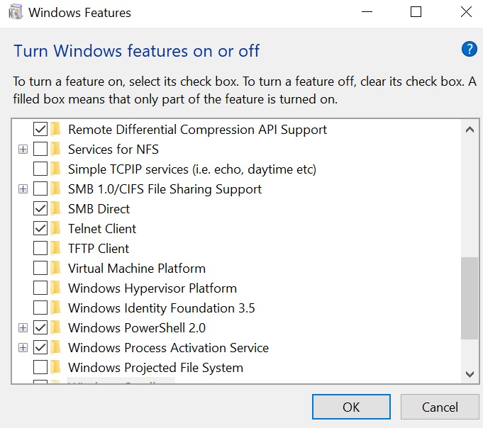 Telentul nu este activat in mod automat. Pentru activare se va naviga in Control Panel->Program and Features->Turn Windows feature on or off, iar din lista de functii disponibile se va activa Telnet Client.