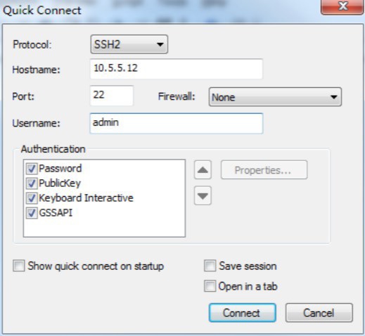 Odata instalat (pe un PC sau laptop din aceeasi retea cu produsul in cauza) se va deschide o noua conexiune cu echipamentul via SSH. Click pe File->Quick Connect... Pentru conectare, vom introduce adresa IP, portul implicit SSH 22 si utilizatorul.