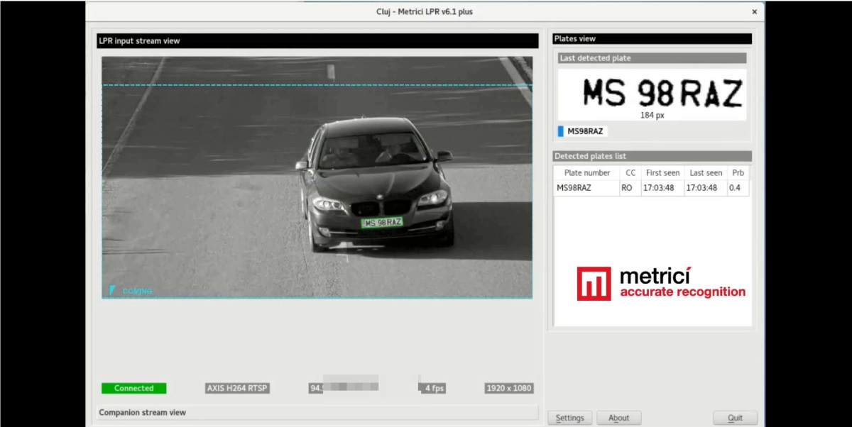 Metrici realizeaza o scanare a fisierelor video, iar datele sunt salvate in baza de date si accesibile in interfata. Toate obisnuitele informatii sunt salvate alaturi de numarul de inmatriculare: tipul de autovehicul, directia de miscare, ora detectiei, cu mentiunea ca este ora detectiei de pe serverul pe care s-a instalat licenta, nu ora cand s-a facut inregistrarea.