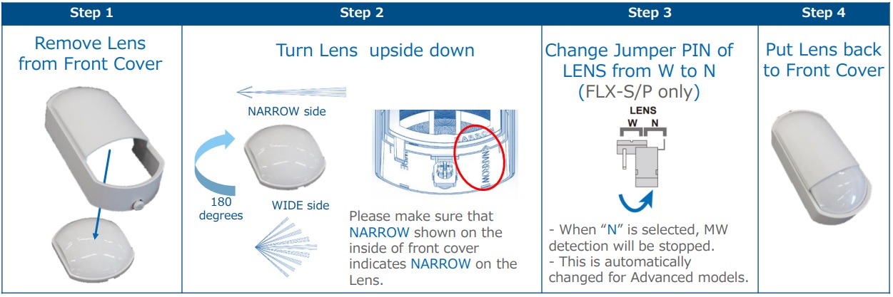 Prin intoarcerea lentilei, aria detectiei poate fi schimbata din larga (wide) in ingusta (narrow) si invers.