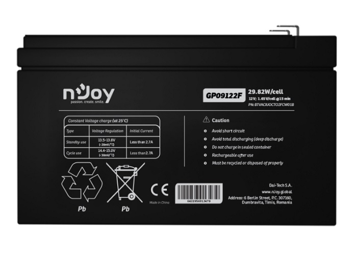 Acumulator UPS, sigilat complet si fara intretinere, incarcare si reincarcare eficiente, autodescarcare limitata, tehnologie Pb-acid AGM, terminal F2 - Faston Tab 250 din cupru, tensiune nominala 12V, 9 Ah, uz in floating si standby pana la 5 ani, mai mult de 260 de cicluri la 100% DOD, putere (1.65 V / celula @ 15 min) 29.82 W / celula, valva siguranta din cauciuc, carcasa din ABS, dimensiuni 151 x 65 x 94.5 mm fara terminal (151 x 65 x 100 mm cu terminal), greutate 2.42 kg