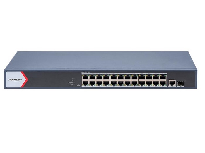 Switch smart managed cu 24 porturi PoE Gigabit, 1 port RJ45 Gigabit si 1 port fiber optical Gigabit, transmisie PoE pana la 300m, standard PoE IEEE 802.3af si IEEE 802.3at, max 30W/port PoE, PoE watchdog, protectie la descarcari electrice pana la 6kV, carcasa din metal, alimentare 100-240 VAC, 50/60 Hz, max. 6.3A