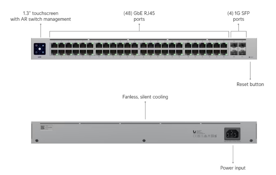 Switch managed Layer 2 cu 48 porturi RJ45 (1G/100M/10M) si 4 porturi SFP (1G), capacitate switching 104 Gbps, display LCM de 1.3" touchscreen, montare in rack (1U), alimentare 100-240 VAC, 50/60 Hz, consum max. 40W, carcasa din otel SGCC, dimensiuni 442 x 285 x 44 mm, racire silentioasa (fanless)