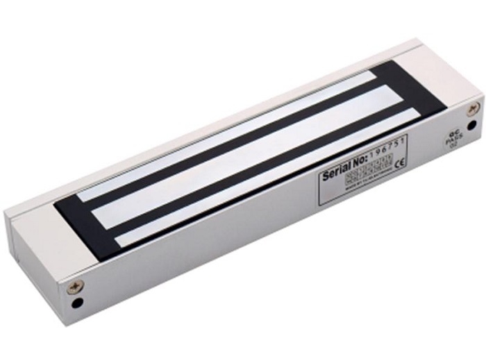 Electromagnet pentru usi din lemn/sticla/otel cu unghi de deschidere de 90 grade, cuplu maxim 272 kg, indicator LED pentru status usa - verde (incuiata) / rosu (descuiata), alimentare 12/24 VDC (default 12VDC), din metariale anti-abraziune, dimensiuni corp yala 240 x 49 x 25.5 mm, dimensiuni placa de armatura 180 x 38 x 11 mm, greutate 2.1 kg