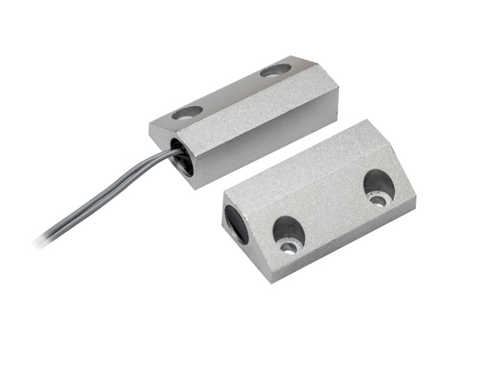 Contact magnetic aplicabil de mica putere, NC, din aliaj de zinc aluminiu, destinat semnalizarii starii unei usi de metal, interspatiu 40-50 mm, tensiune 100 Vcc / 0.5 A, culoare gri