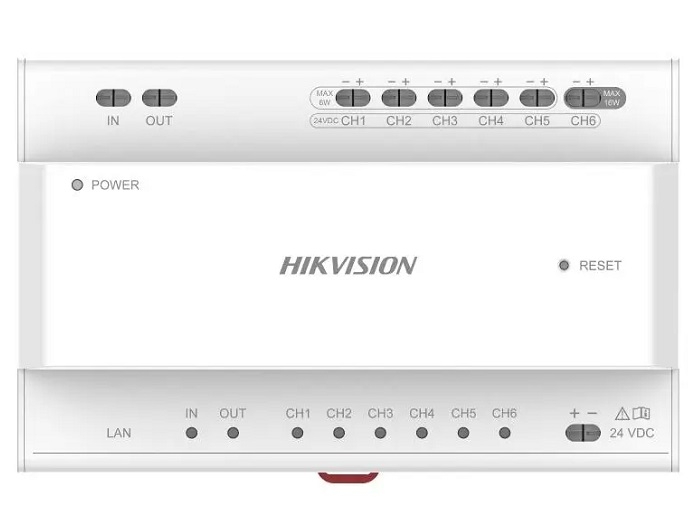 Distribuitor audio/video pentru sistemele de videointerfonie Hikvision cu 2 fire, are 6 porturi, 1 buton de Reset, 8 indicatoare de interfata, 1 interfata RJ-45, alimentare 24 VDC