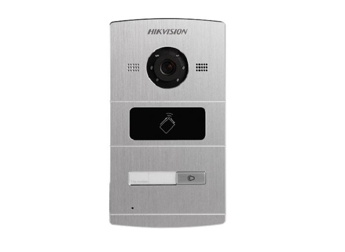 Videointerfon IP Hikvision de exterior, 1 buton, camera 1.3MP, cititor de carduri Mifare 13.56MHz, posibilitate de conectare buton de iesire, contact magnetic, leduri IR, 1 intrare/4 iesiri de alarma, RS-485, RJ-45, 12VDC/24VDC de la distribuitorul DS-KAD606-P, 12W
