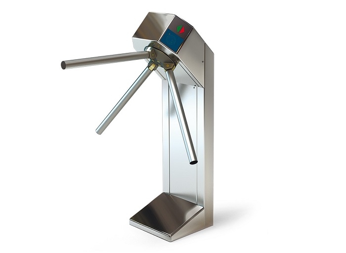 Turnichet bidirectional motorizat de interior, AURIU, un picior, 3 brate tip drop-arm aurii, anti-panic, latime blocaj 530mm, 20 persoane/minut, indicatoare LED la ambele capete, modul electronic complex de control inclus, 24V DC