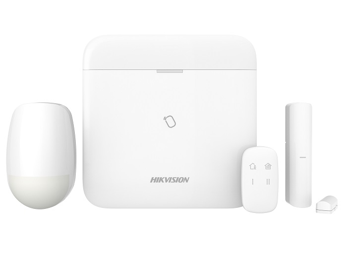 Kit antiefractie wireless Hikvision AX PRO ce contine o centrala 96 canale DS-PWA96-M-WE, o telecomanda DS-PKF1-WE, un detector DS-PDP15P-EG2-WE si un contact magnetic DS-PDMC-EG2-WE.
