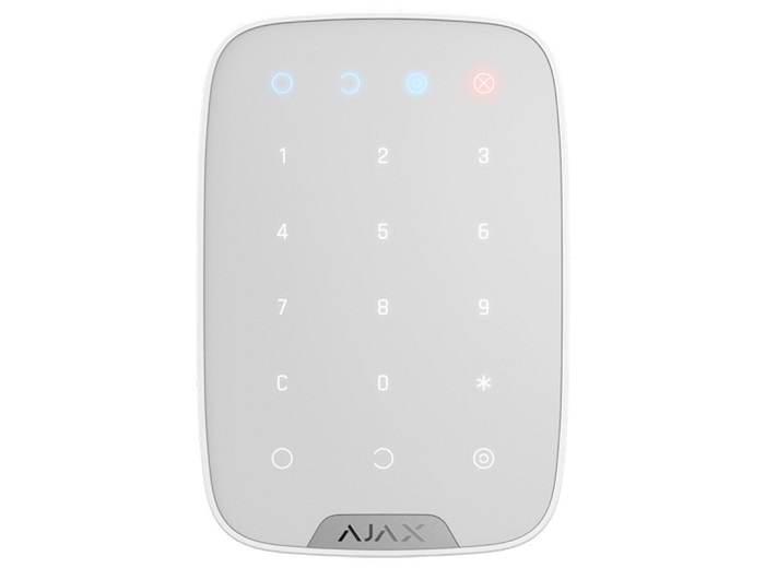Tastatura wireless alba cu 15 butoane touch, cod Duress, cod utilizator, protectie impotriva ghicirii codului utilizatorului, protectie antisabotaj, indicator stare armat/dezarmat, distanta semnal radio max. 1700 m, alimentare cu 4 baterii AAA, 3 V, dimensiuni 150 x 103 x 14 mm, greutate 197g
