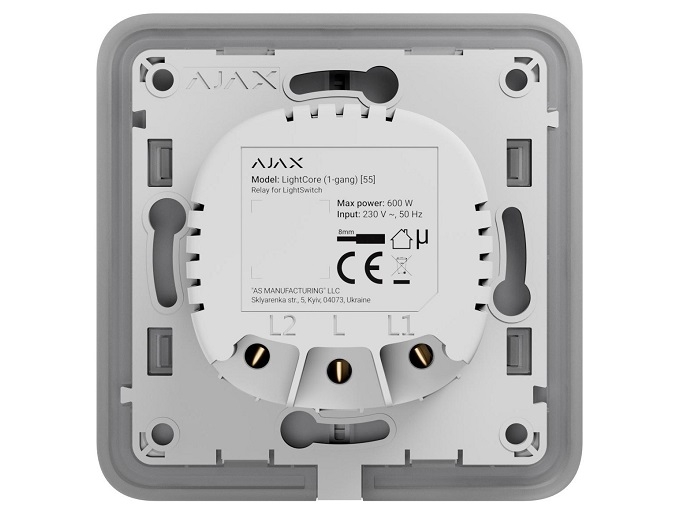 Releu LightCore 2-gang, dimensiuni 76.3 x 72.3 x 29.2 mm, greutate 53.9g. Impreuna cu butonul SoloButton 2-gang formeaza intrerupatorul LightSwitch 2-gang care activeaza 2 dispozitive prin apasare sau apropierea mainii la maxim 15 mm. Compatibil cu Hub Plus, Hub 2 (2G/4G), Hub 2 Plus, Hub Hybrid (2G/4G), Rex si Rex 2.