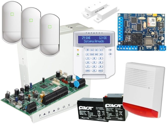Kit centrala Paradox Spectra SP5500 + cutie metalica AWO 000EI cu transformator + tastatura cablata cu 32 zone K32LCD + 3 x detector PIR cu lentila duala (wide / narrow) FLX-S-ST + sirena de exterior autoalimentata cu flash SIR-12V + acumulator PL7AH + acumulator PL5AH + contact magnetic alb SM-35 WH + modul SEKA GPRS CID