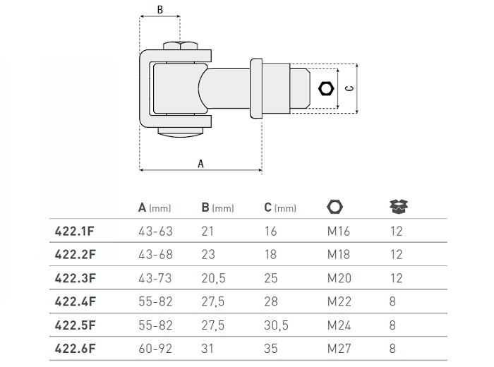 Balama superioara F cu suport pentru a fi sudat si cu surub, M16, dimensiuni 43-63 x 21 x 16 mm