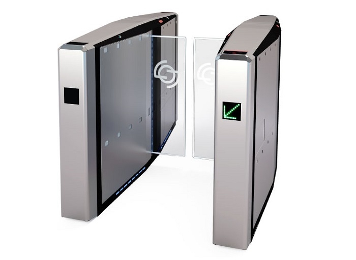 Unitatea MASTER si SLAVE a unei porti de limitare acces, de interior, din inox si sticla, latime pasaj 550mm, limitarea accesului e realizata cu foi de sticla care in mod implicit sunt in pozitia deschis, acces 30 persoane/minut, modul electronic complex de control inclus, 24VDC, dispaly 5" incorporat pentru afisarea starii pasajului, directiei de acces si informatii balanta credit pe cardul utilizatorului. Poate fi echipat cu cititor de carduri 125kHz RFID, MIFARE 13.56 MHz, tichete cu benzi magnetice sau scaner de coduri de bare 1D/2D.