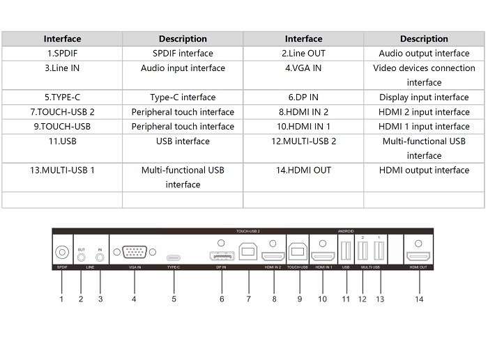 Tabla interactiva cu diagonala de 75 inch si camera 8MP, microfon omnidirectional, rezolutie ecran 3840x2160 @60Hz, pixel pitch 0.14325(H) × 0.42975(V) mm, luminozitate 400cd/m², contrast 4000:1, sistem de operare Android 12.0, 8GB memorie, 128GB stocare interna, infrared touch screen, 45 puncte multi-touch, raspuns touch <8ms, precizie ± 1mm, 2 x difuzoare 15W+25W incorporate, bluetooth BLE incorporat, alimentare 100-240 VAC, 50/60 Hz, VESA 800mm x 400mm (4 x M8-25mm), dimensiuni 1713.2 x 1034.5 x 82.5 mm