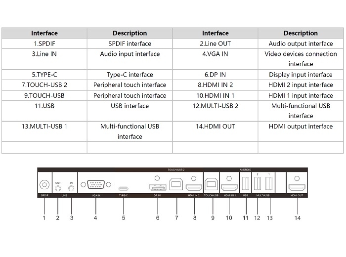 Tabla interactiva cu diagonala de 86 inch si camera 8MP, microfon omnidirectional, rezolutie ecran 3840x2160 @60Hz, pixel pitch 0.1645(H)× 0.4935(V)mm, luminozitate 400cd/m², contrast 4000:1, sistem de operare Android 12.0, 8GB memorie, 128GB stocare interna, infrared touch screen, 45 puncte multi-touch, raspuns touch <8ms, precizie ± 1mm, 2 x difuzoare 15W+25W incorporate, bluetooth BLE incorporat, alimentare 100-240 VAC, 50/60 Hz, VESA 800mm x 600mm (4 x M8-25mm), dimensiuni 1960.5 x 1173.7 x 82.5 mm