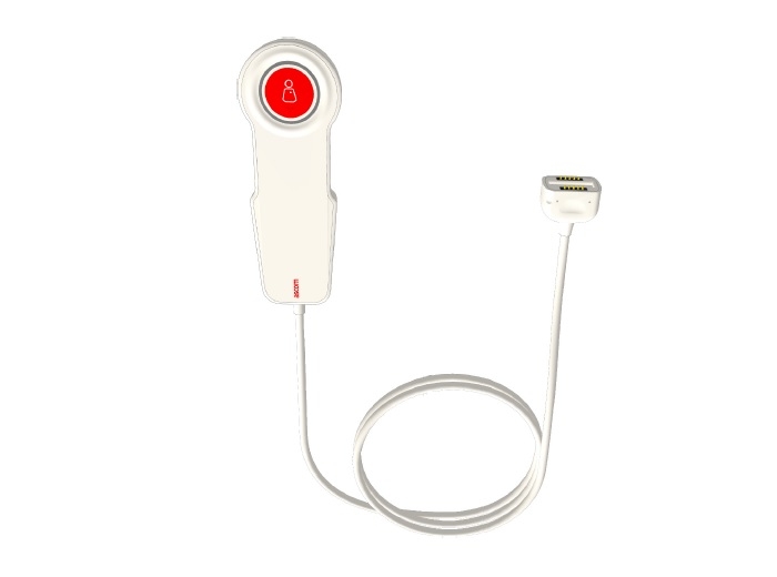 Terminal cu 1 buton de apelare pentru pacienti (varianta Global), buton rosu mare cu backlight (plus 3 puncte in relief pentru persoanele cu probleme de vedere), cablu flexibil 6-core cu lungime de 3m, se conecteaza cu seria de module NUBM, dimensiuni 151 x 53 x 22 mm, greutate 201g, carcasa alba din PC/ABS cu membrana de silicon pentru curatare facila, IP67, compatibilitate cu Telligence 5.0 si mai recente