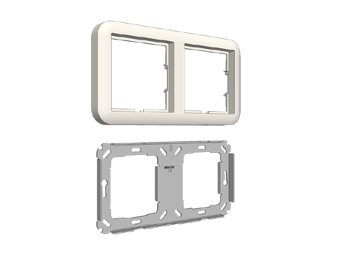 Rama pentru instalarea a 2 module din seria HE 60*60 (pe orizontala), rama din PBT/PC, culoarea alba, include adaptor metalic care asigura spatierea corecta a modulelor, 71mm spatiere intre module, IP40, dimensiuni 81 x 152 x 13 mm, greutate 85g