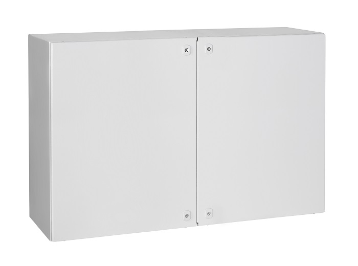 Cutie din tabla metalica + contrapanou, 2 usi, maner rotativ si 4 incuietori standard dublu bit, cu 2 flanse fiecare L=400 A=190 mm, tip E, IP54, IK10, dimensiuni 1000 (inaltime) x 1000 (latime) x 300 (adancime) mm, culoare gri deschis, standard produs EN 62208