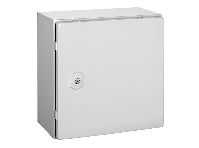 Cutie din tabla metalica + contrapanou, 1 usa, cu 1 incuietoare standard dublu bit, cu o flansa L=200 A=115 mm, tip A, IP66, IK10, dimensiuni 300 (inaltime) x 300 (latime) x 210 (adancime) mm, culoare gri deschis, standard produs EN 62208