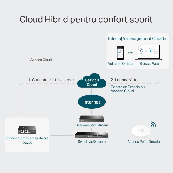 Controller hardware Omada, management centralizat - pana la 100 access point-uri Omada, 20 switch-uri JetStream si 10 routere Omada, procesor Dual-Core A53 @ 1.2 GHz, memorie 1 GB DDR3, stocare 1 MB Nor Flash si 4 GB eMMC, 2 porturi 10/100 Mbps Ethernet, 1 port USB 2.0 si 1 port micro-USB, management multi-site (max. 100 locatii), management multi-tenant - privilegii per rol/locatie/dispozitiv, access cloud, migrare, management account (max. 1000 conturi), alimentare 802.3af/at PoE; Micro-USB (5VDC/ min. 1A)