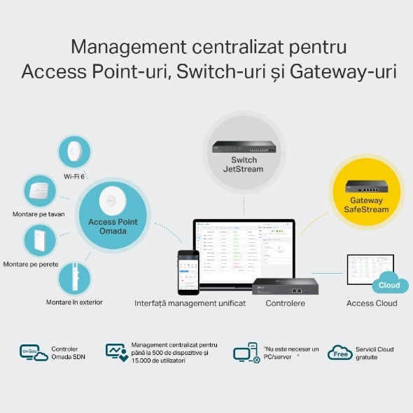 Controller hardware Omada, management centralizat - pana la 500 access point-uri Omanda, 100 switch-uri JetStream si 100 routere Omada, procesor Quad-Core A72 @ 1.2 GHz, memorie 2 GB DDR4, stocare 2 MB Nor Flash si 8 GB eMMC, 2 porturi 10/100/1000 Mbps Ethernet, 1 port USB 3.0, management multi-site (max. 100 locatii), management multi-tenant - privilegii per rol/locatie/dispozitiv, access cloud, migrare, management account (max. 1000 conturi), alimentare 100-240 VAC 50/60 Hz