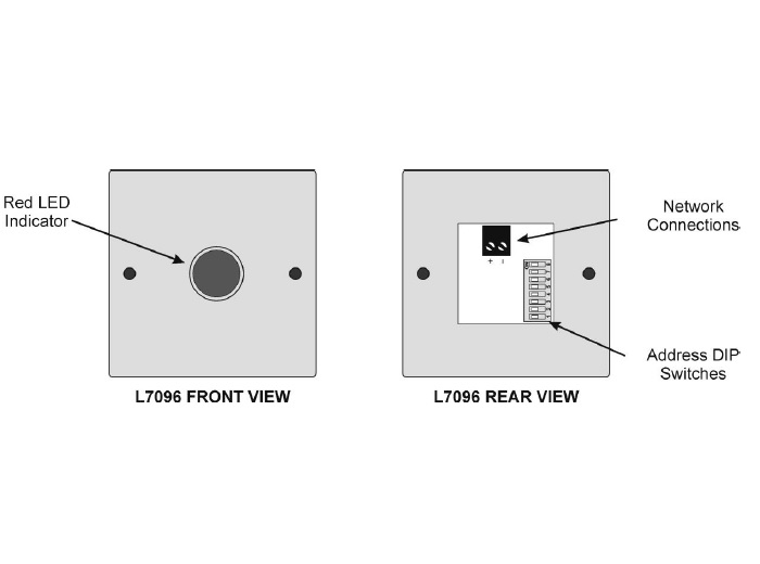 Unitate cu indicator LED rosu pentru monitorizarea statusului unei singure celule/incaperi (repetand tiparele LED ale unitatii L7021 - apel, prioritate, urgenta, acceptare si resetare), instalare deasupra usii sau in alta zona unde asocierea se poate face usor, LED cu diametru mare, placa din otel inoxidabil, DIP Switch-uri setate la aceeasi adresa precum unitatea L7021 pe care o imita, fara necesitarea cablarii directe (multiple unitati L7096 poate fi setate la o adresa)