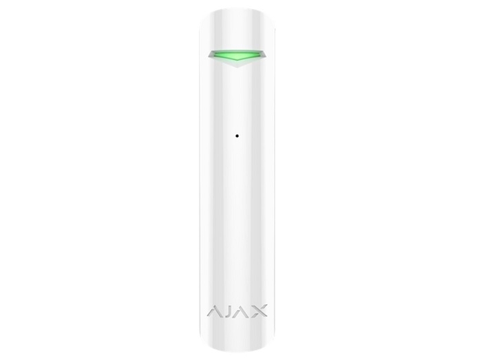 Detector de geam spart cu microfon electret wireless de interior, culoare alba, distanta detectie geam spart max. 9 m, acoperire microfon 180°, protectie antisabotaj, distanta semnal radio max. 1000 m, alimentare cu 1 baterie CR123A, 3 V, dimensiuni Ø 20 x 90mm, greutate 30g
